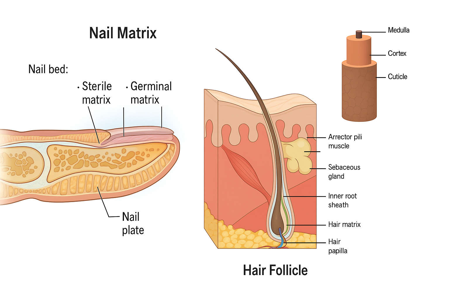 - 손톱: 피부 바로 밑의 ‘손톱바닥(nail matrix)’에서 자라며,